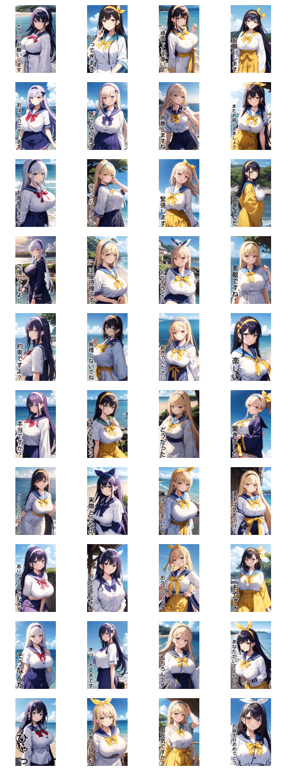 | スタンプ説明 | アニメ、甘い、可愛い、かっこいい、写真、美女、女の子、唯美、セーラー服、日常用語 ※このスタンプはトークルームで大きく表示されるBIGスタンプです。 |