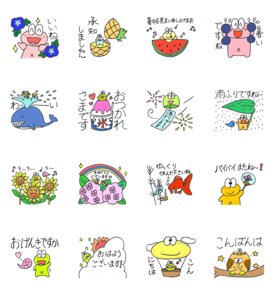 夏向けの動くスタンプです。おへそがかわいいかえるです。あまがえるなので体の色が変えられます。おたまじゃくしの弟妹がたくさんいます。
