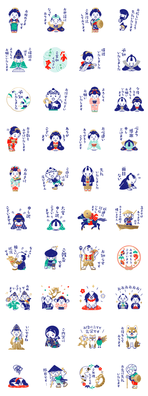 仕事で使える和のスタンプです。取引先や同僚など、仕事仲間宛に。現代語多め。 敬語/丁寧語/社会人/大人/気遣い/和風/着物/侍/舞妓/忍者/足軽/山伏/柴犬/狆/トラ猫