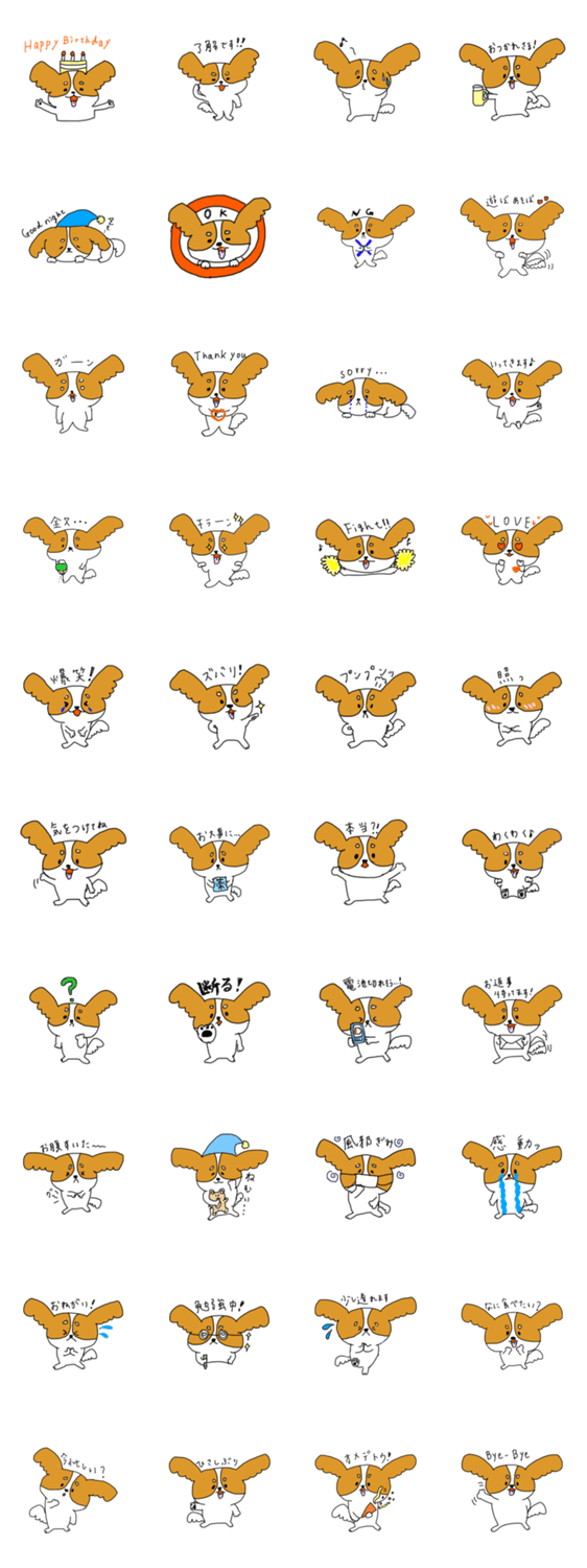 日常会話で使えるわんこ(パピヨン)のスタンプです。