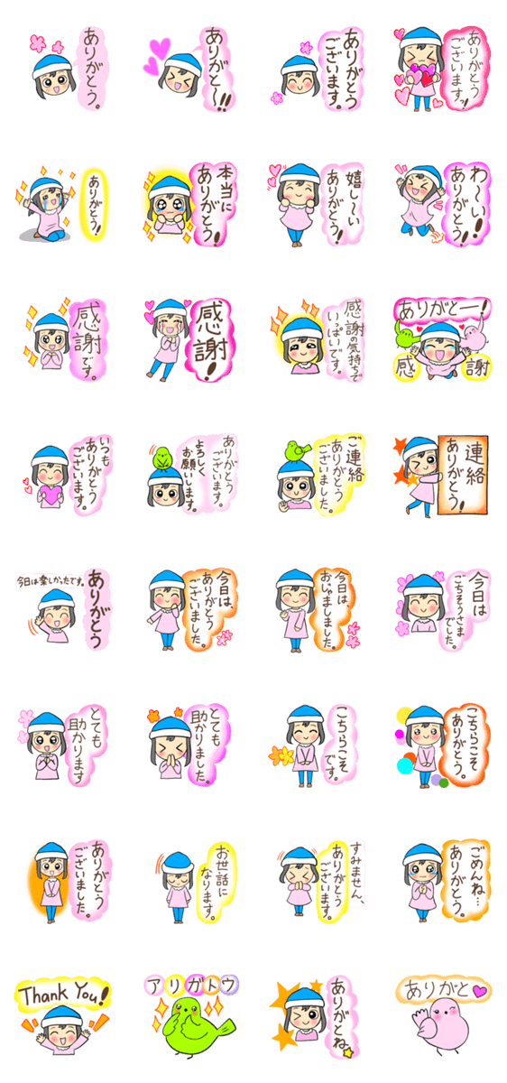 色々なありがとう・感謝の気持ちの言葉だけを集めたニット帽の女の子スタンプです。ありがとう・感謝の思いを色んな表現で表情豊かに伝えられます。