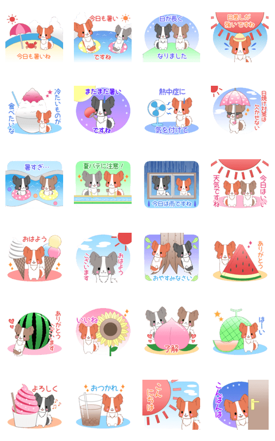 小さいパピヨンたちのスタンプ第11弾。レッド/セーブル/ブラウン/ブラック/カワイイ/可愛い/キュート/犬/イヌ/もふもふ/モフモフ/挨拶/日常会話/気持ち/感情/夏