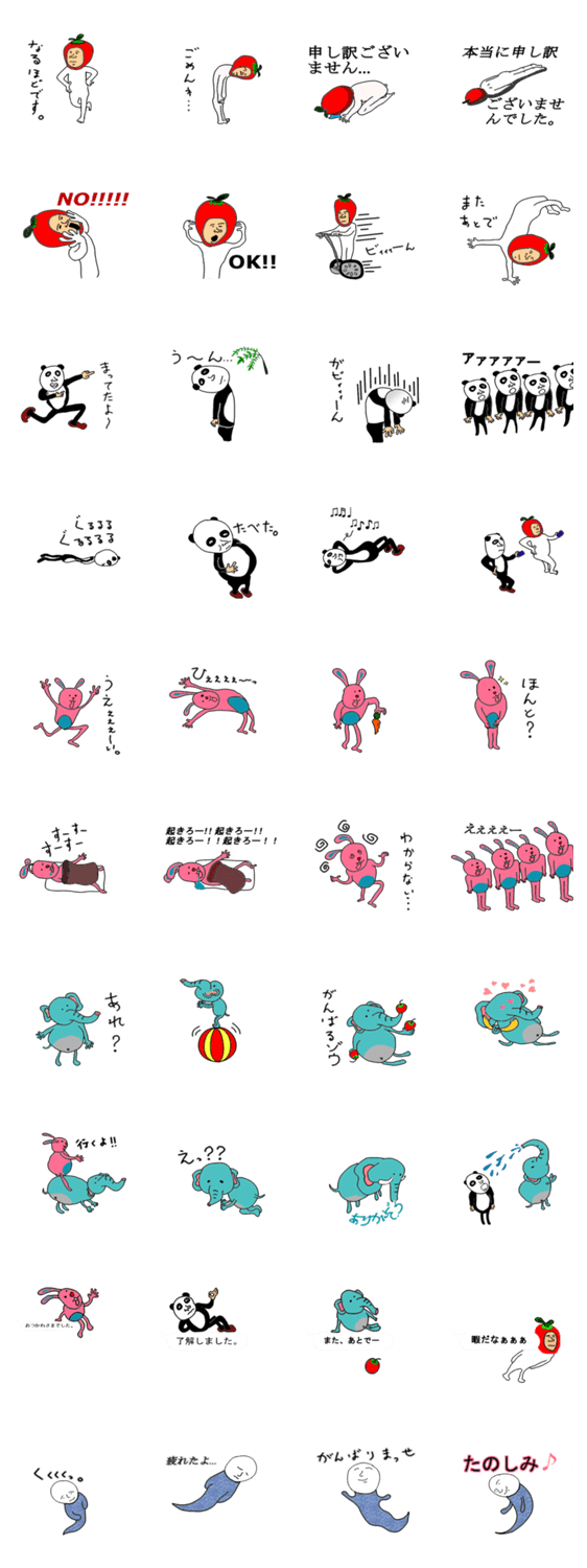 うさぎ、パンダ、ぞう、の使いやすいシュールでゆるゆるなかわいいスタンプです。