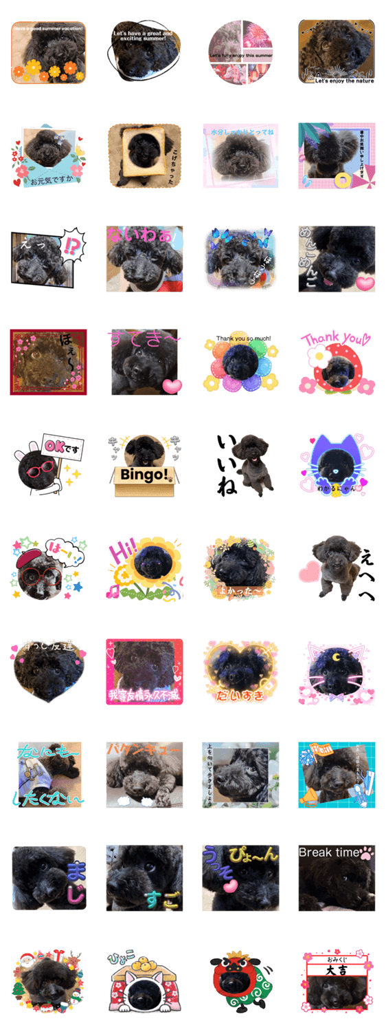 | スタンプ説明 | LINEスタンプメーカーでつくったスタンプです。便利に使える可愛い黒トイプードルちゃんのスタンプです♪年中使えて癒したっぷり♪ |