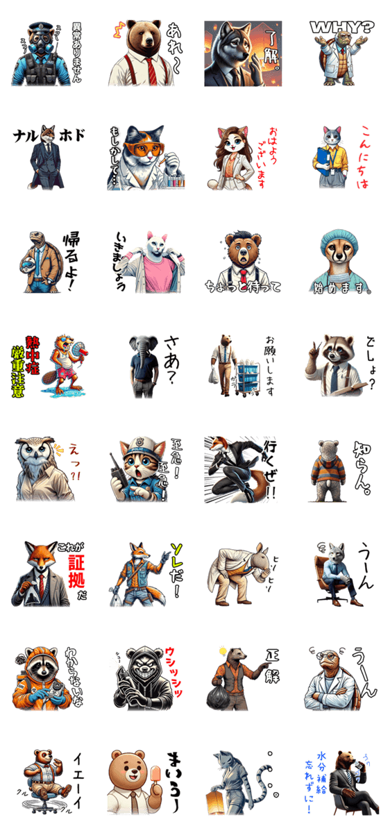 科捜研で仕事をする動物たちによる日常でも使えるスタンプです。