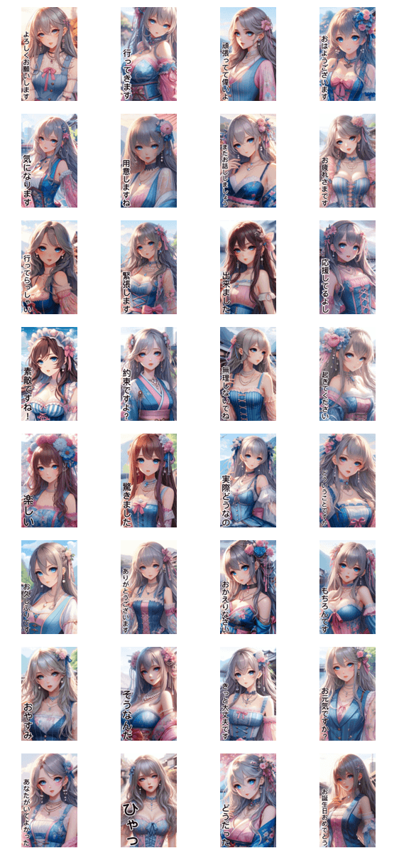 | スタンプ説明 | アニメ、甘い、可愛い、かっこいい、写真、美女、女の子、唯美、夢幻、日常用語 ※このスタンプはトークルームで大きく表示されるBIGスタンプです。 |