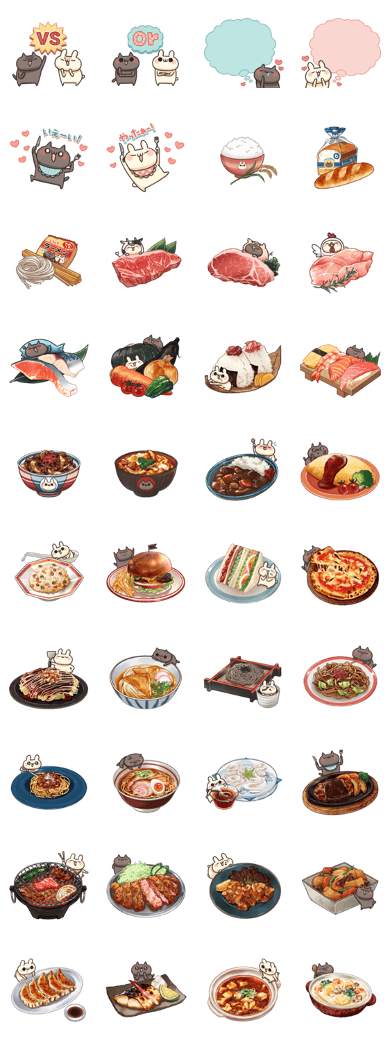うさぎのしろとねこのくろのスタンプ第二十六弾です。今日何を食べようか迷った時や、食べたいものを伝えたい時にとっても便利!