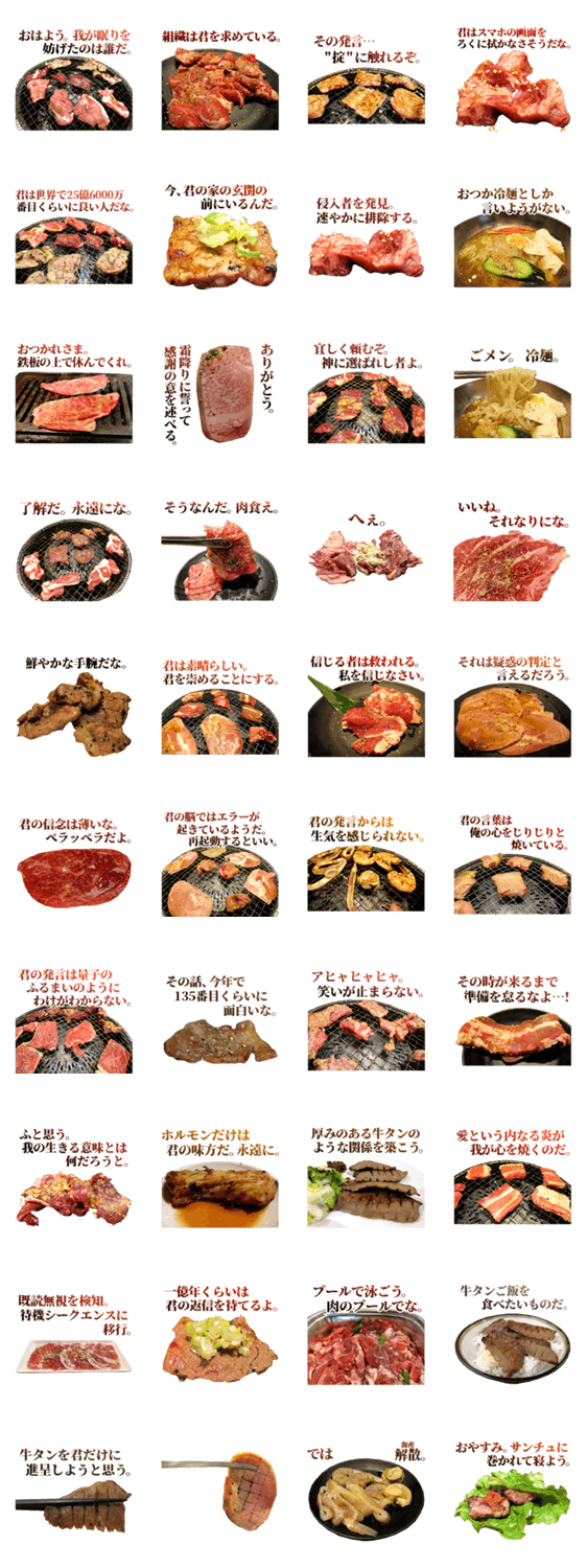 焼き肉の、使いどころに乏しいかもしれないスタンプです。生肉、牛肉、ホルモン、冷麺、霜降り肉、飯テロ、BBQ、サンチュ。実写食べ物スタンプシリーズ。