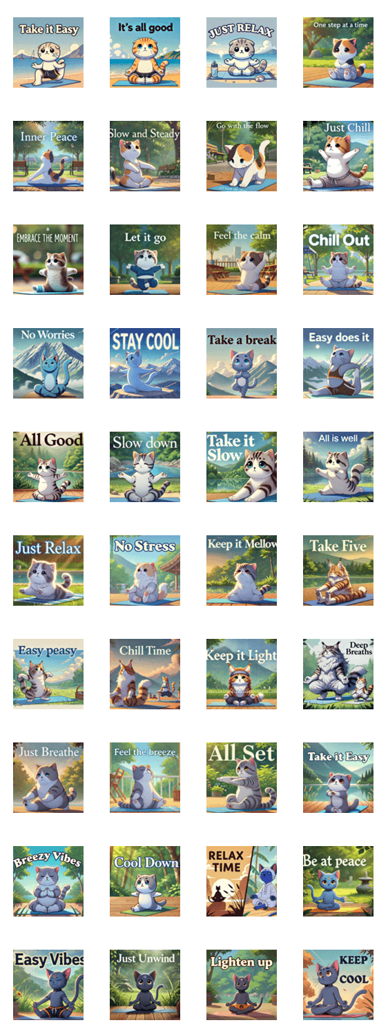 ヨガを楽しむリラックスした猫たちが登場!癒しと笑いを提供するスタンプで、あなたのチャットをもっと楽しく!