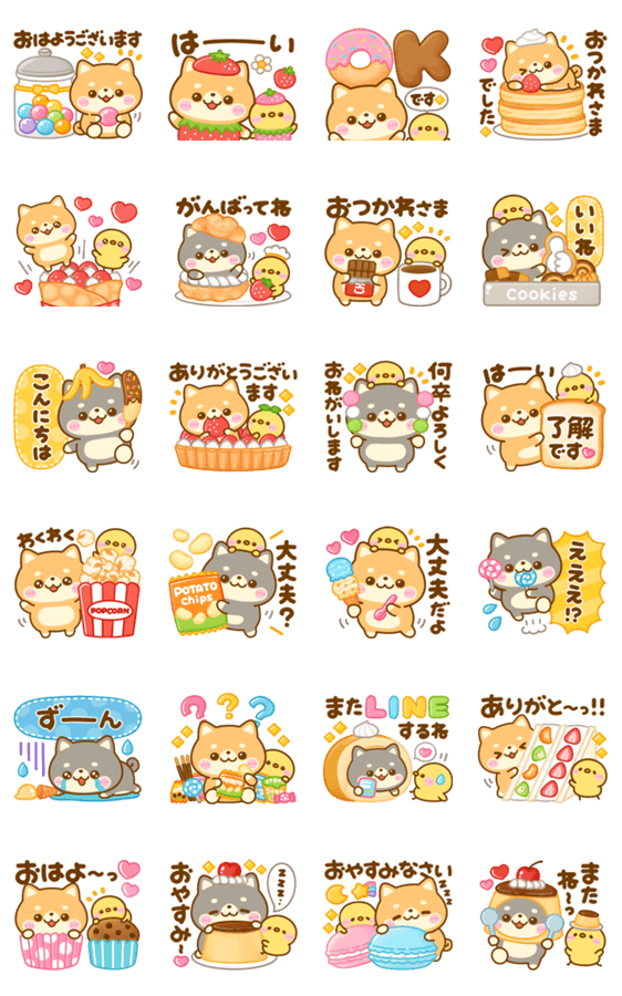 スイーツいっぱい!毎日使えるあいさつ言葉が揃ったかわいい柴犬のポップアップスタンプです。