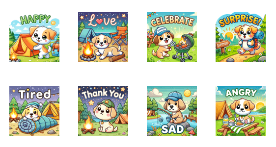 可愛いキャンプ犬スタンプでチャットを楽しんでください!喜びや愛など、さまざまな感情を表現するのに最適です。夏の雰囲気にぴったり。