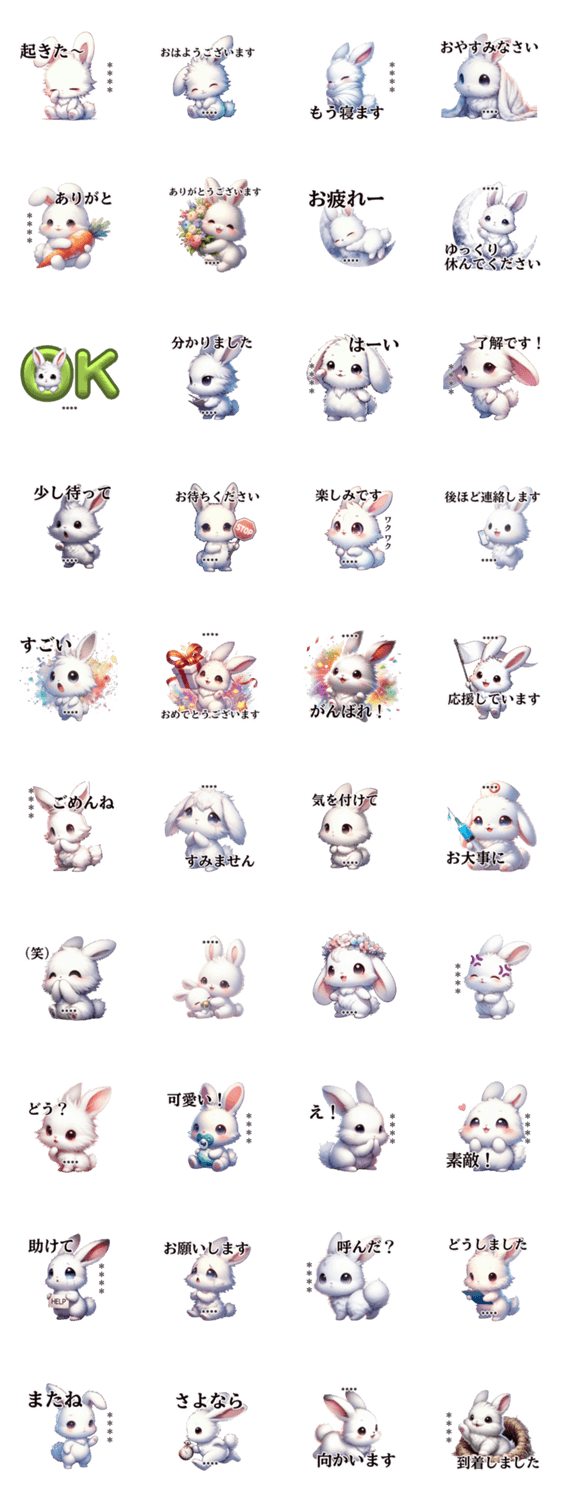 主に日常に使えるうさぎのカスタムスタンプです。10文字が上限です。(兎/挨拶/感謝/確認同意/返事応答/お祝い応援激励/謝罪/感情/お願い/終了/敬語)