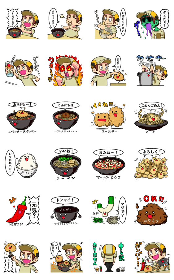 タンタン麺屋の店長と食材、メニュー達をスタンプに致しました。 少し偏っていて、かわいいスタンプです。