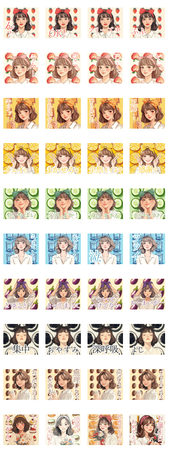 みずみずしいフルーツなどを背景に、水玉模様のカチューシャをつけたレトロな女の子たち。お祝いや感謝の気持ちを伝えるメッセージ付き!推しの子を見つけてください♪