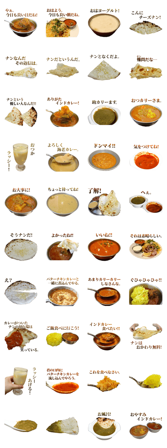 カレーとナンの一年中毎日使えるスタンプです。インドネパール料理、バターチキンカレー、ダルカレー、サフランライス、バスマティライス、ビリヤニ、チーズナン、ラッシー