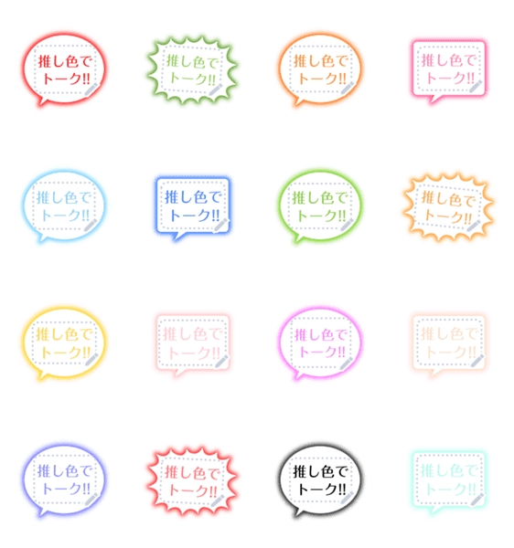 あなたの推しカラーはどんな色? 好きな文章が書き込めるぼかし吹き出しで思う存分推しトークができちゃう♪汎用性高めのメッセージスタンプ★ 現在この商品は一部のスマートフォン版LINE 10.3.0以上のトークルームでのみ使用できます。動作環境の最新情報はヘルプをご確認ください。
