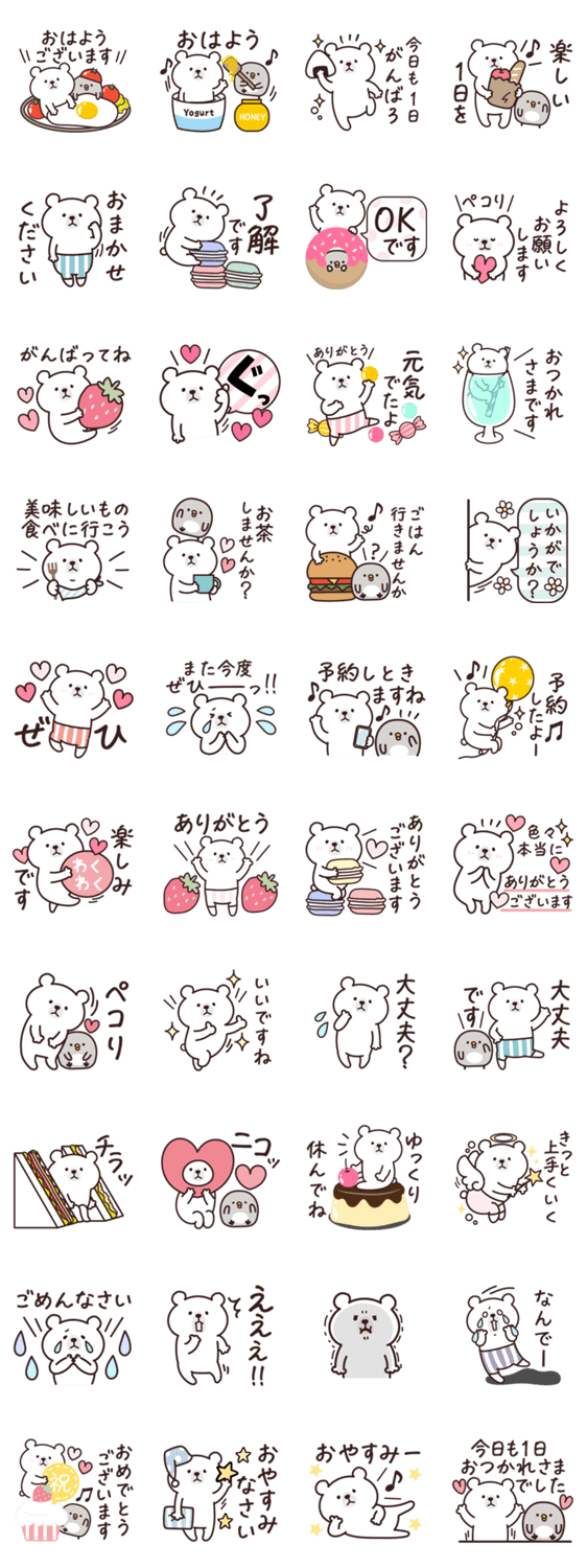 しろくま・ペンギンの、食べ物のイラストが多いスタンプ♡お誘い言葉から、日常のよく使う言葉も入ってます!お友達・ママ友に使える♪