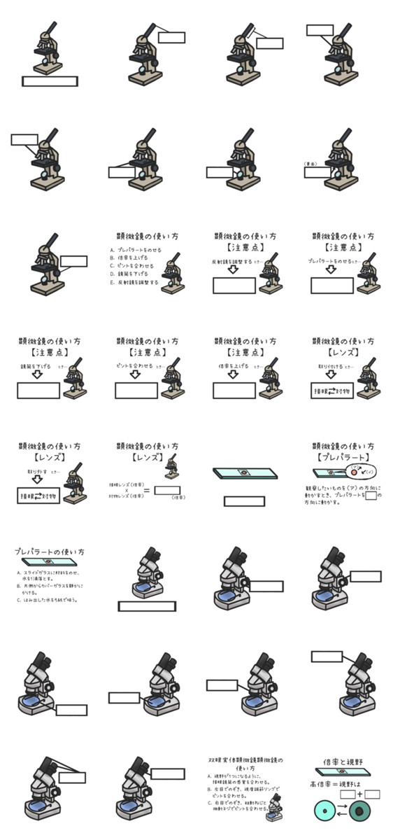 スタンプでお勉強しよう!今回は「理科(用具編②)」。顕微鏡などの使い方に関する知識をチェック!!お友達にスタンプを送って、答えてもらおう。
