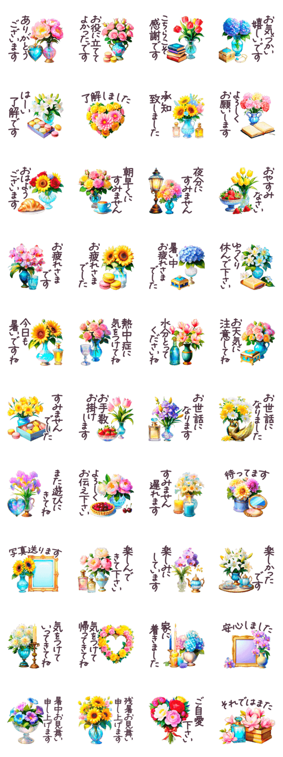 夏によく使う言葉と日常スタンプ/お盆/夏/夏休み/帰省/連絡/挨拶/敬語/丁寧/日常会話/グループ/PTA/ママ友/先輩/家族/友達/花束/お花/花/バラ/でか文字/文字大きめ/老眼