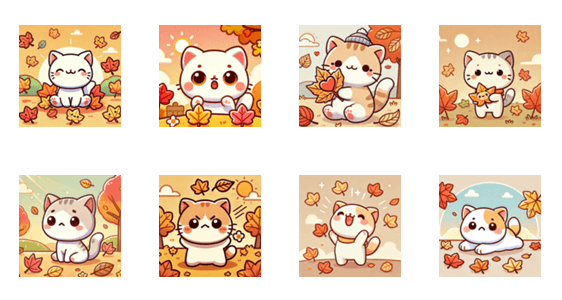 紅葉狩りを楽しむかわいいネコちゃんたちが、さまざまな感情を表現します。幸せ、驚き、愛などの気持ちをチャットで伝えましょう!