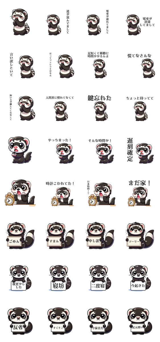 遅刻したときに使える、かわいくてユニークなブラックセーブルのフェレットのLINEスタンプが登場!悪びれていないので使用にはご注意を!