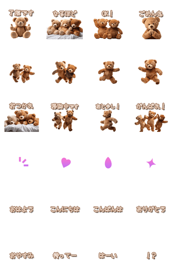 このかわいいテディベアのスタンプで、毎日の会話をもっと楽しく!「了解です」など、普段使いにぴったりなフレーズがいっぱい。熊/クマ/くま/かわいい/組み合わせ/挨拶