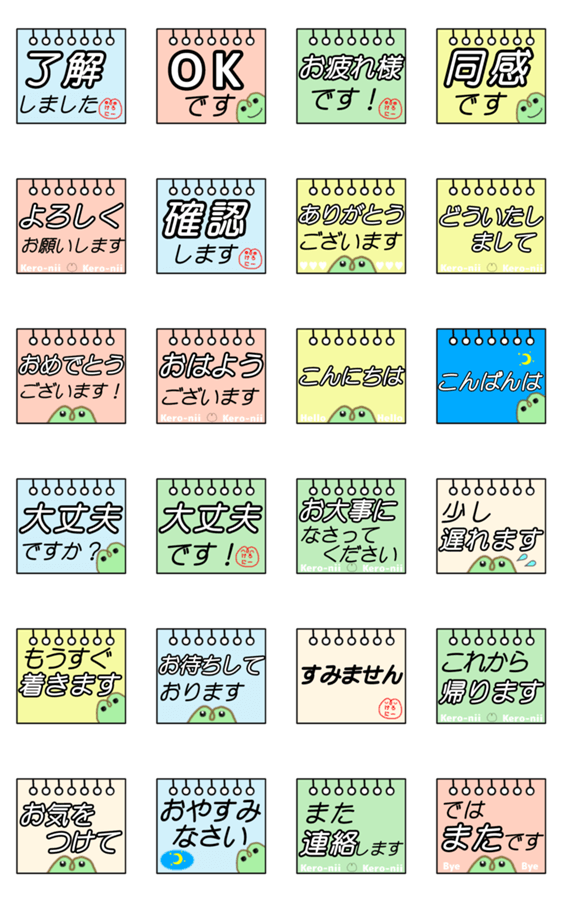 使いやすい言葉を集めたカエルのけろにーさん柄のメモ帳風スタンプです。 でか文字/日常会話/普段/シンプル/見やすい/大きい文字/挨拶