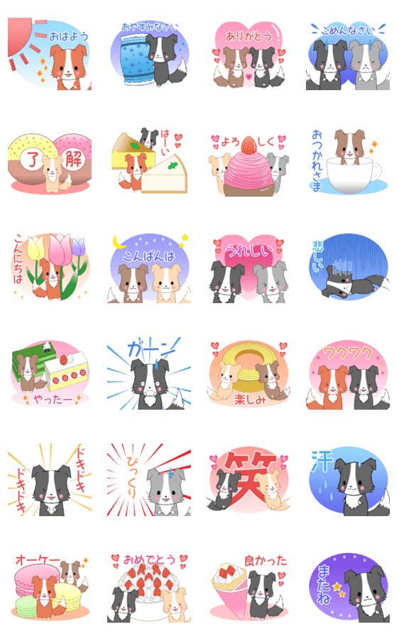 小さいボーダーコリーたちのスタンプ第16弾。ブラック/レッド/チョコ/ブルー/クリーム/かわいい/カワイイ/可愛い/犬/もふもふ/モフモフ/挨拶/日常会話/気持ち/感情