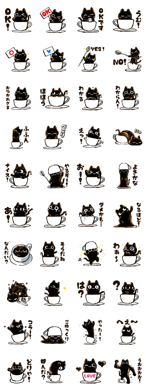 普段使いができる、猫のようなコーヒーのようなキャラクターの反応を送りやすいスタンプです。