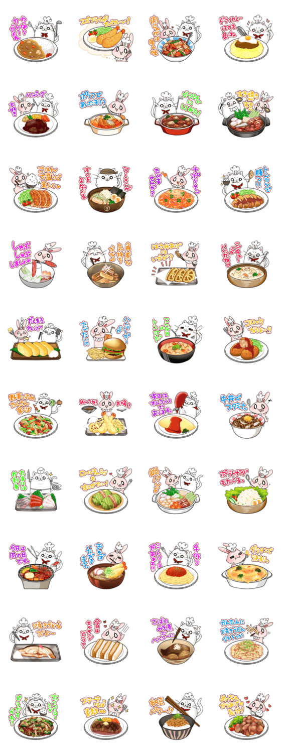 コックさんのネコ「ひっちょ」と、ちょっぴり食いしん坊な助手のウサギ「つきまろ」がお腹の虫を刺激します♪毎日の食事や献立の参考などにどうぞ!