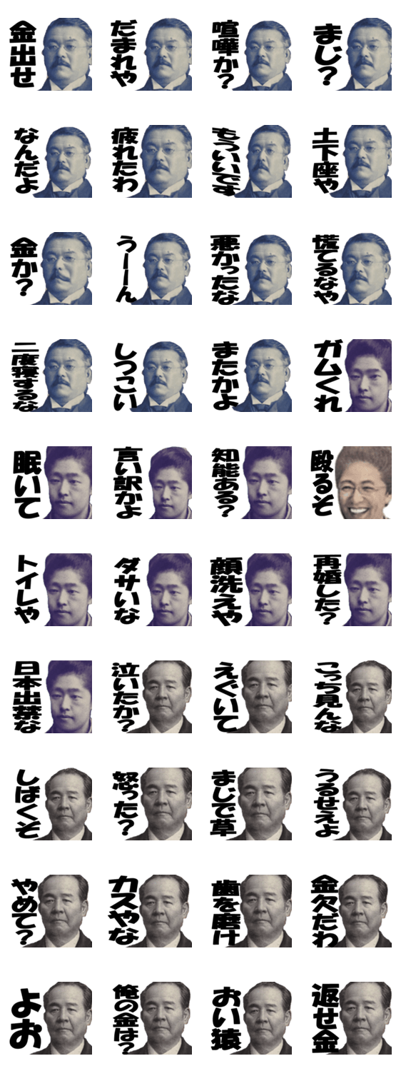日常会話や家族のグループラインで毎日使える新貨幣スタンプ 新紙幣/新札/渋沢栄一/津田梅子/北里柴三郎/一万円/五千/千円/うざい/クイズ/お金/面白い/ボケ/シュール/