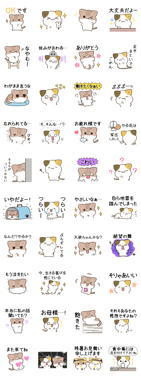 お疲れ気味やる気が出ない時にゆるかわ三毛猫とキジトラ白猫のスタンプ 仕事 休み 気づかい 挨拶 食中毒 残暑見舞い 毒舌 敬語 アイスキャンディー