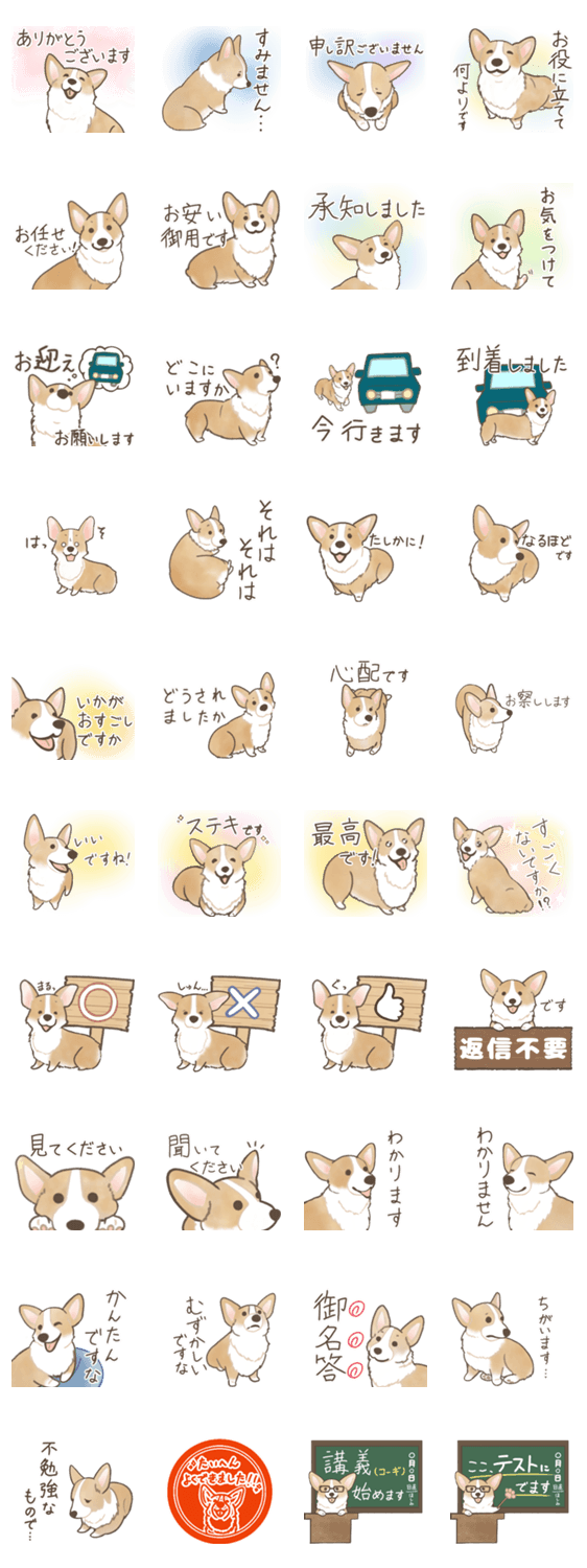 ほんわかとしたやさしいタッチのコーギーが登場する、日常会話のスタンプ第2弾です。この他にも、講義とコーギーをかけたスタンプなど、勉強に関する言葉もあります。
