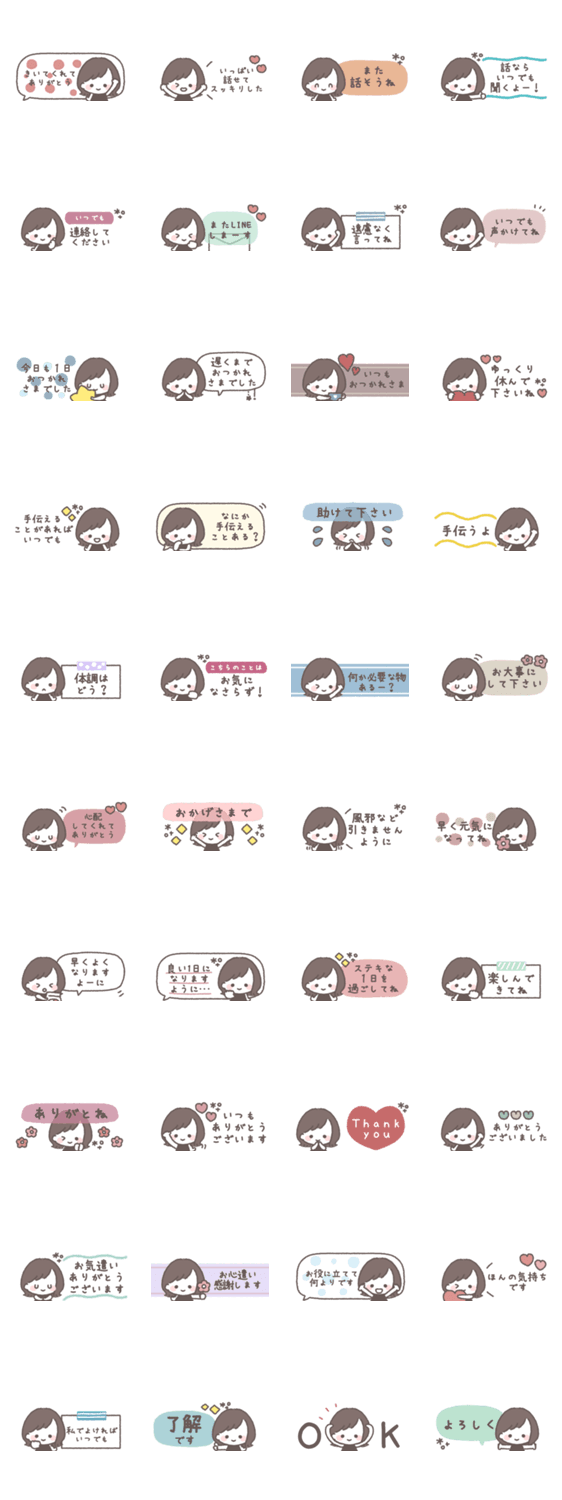 一つあると便利な女の子のスタンプです。 女の子/ボブ/大人可愛い/シンプル/あいさつ/吹き出し/くすみカラー
