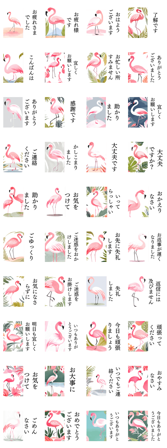 おしゃれなフラミンゴで丁寧語の挨拶スタンプです。大人敬語やさしい毎日使えるずっと使える日常スタンプおしゃれ癒しふんわり友人家族仕事ビジネス毎日日常丁寧語