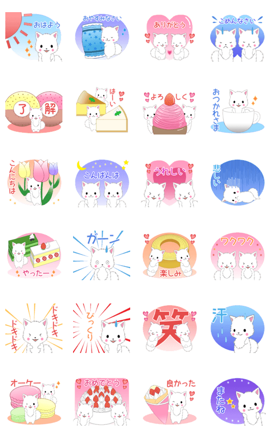 小さい白モフわんこたちのスタンプ第12弾。ホワイト/白/ポメラニアン/スピッツ/サモエド/カワイイ/可愛い/犬/もふもふ/モフモフ/挨拶/日常会話/気持ち/感情