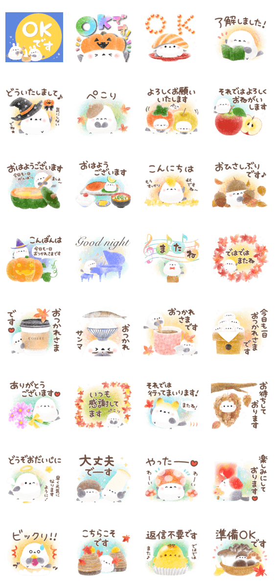 音楽の秋、食欲の秋、読書の秋、お月見にハロウィン…シマエナガさんと秋の詰め合わせです♪水彩タッチでふんわり柔らかく、誰にでも送りやすいです。