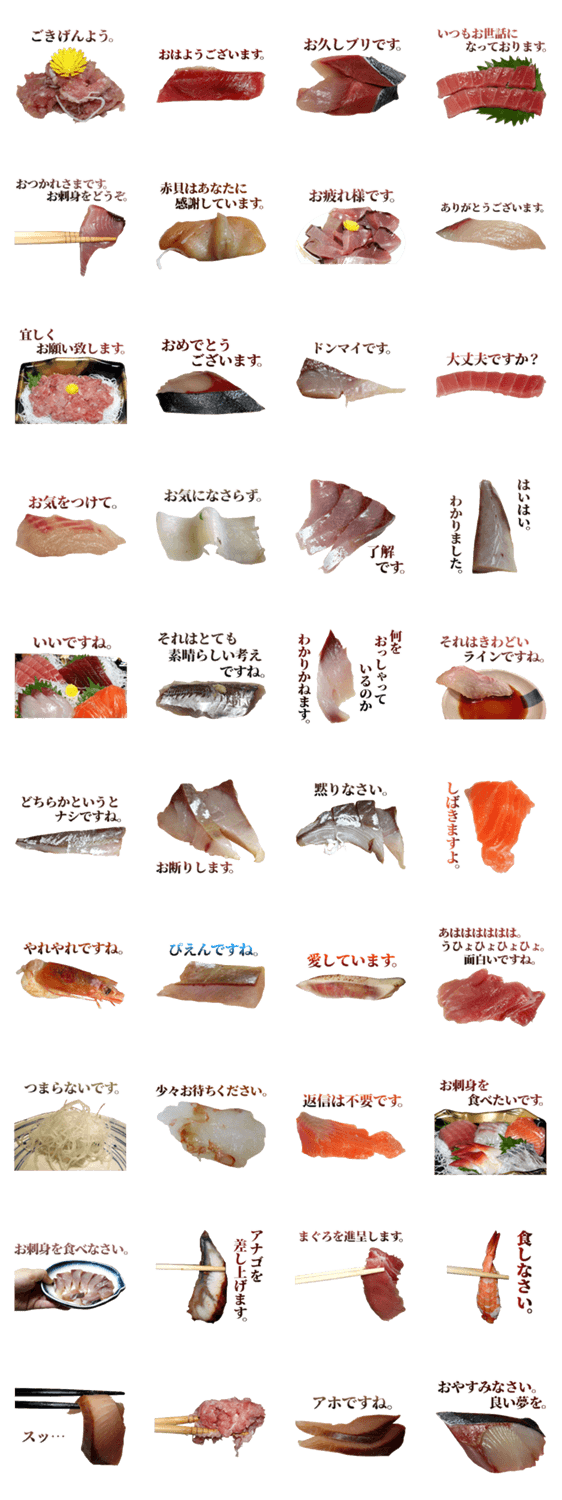 敬語を使うお刺身のスタンプです。どなたでも使いやすいですね。丁寧語、生魚、海鮮類、おさしみ、お刺し身、まぐろ、サーモン、海老、ブリ、実写食べ物スタンプシリーズ。