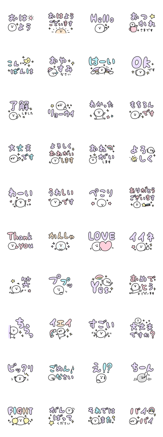 パープルがメインのパステルカラーでかわいいデカ文字セットです。シンプルで使いやすいしろまーるのスタンプです。 ゆるい/シンプル/かわいい/敬語/人気/毎日使える/