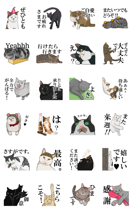 基本敬語でポジティブなメッセージを伝えるネコのスタンプ