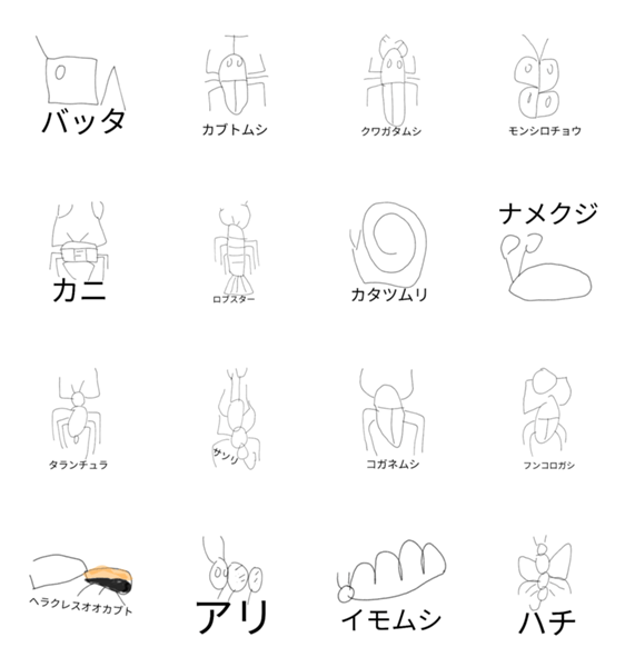 | スタンプ説明 | 第酸弾でも言ってると思いますが、イラストは全てメモで描いてます。申し遅れました。チキン森田ツタです。今回は昆虫と甲殻類をシュールに描いてみました。 |