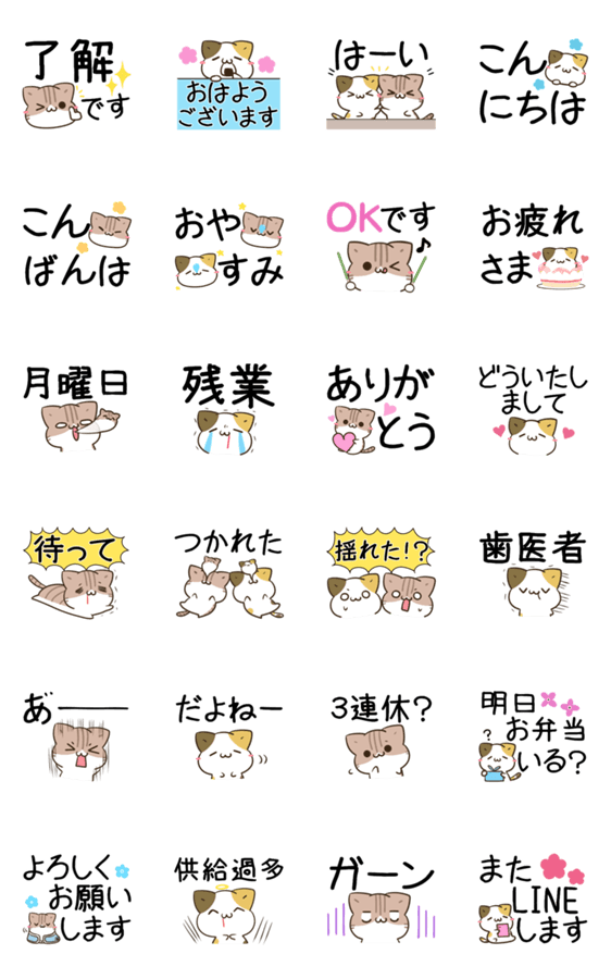 お疲れ気味やる気が出ない時に!ゆるかわ三毛猫とキジトラ白猫のデカ文字アニメーションスタンプ 仕事 社畜 地震 ストレス 敬語 家族 連絡 残業 月曜日 歯医者 3連休