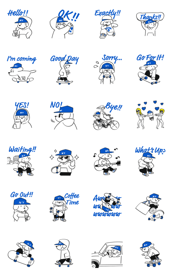シバチャンのオリジナルキャラクター「スケータージョン」の初スタンプ。ジョンは犬でありながらスケボー、サーフィン、HIP-HOPが趣味のニューヨーカーです。