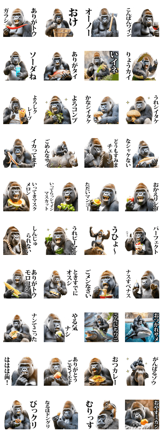 | スタンプ説明 | ゴリラのダジャレスタンプです。日常会話にゴリラダジャレをそっと添えてみてください!!!なごみますよ!!! |