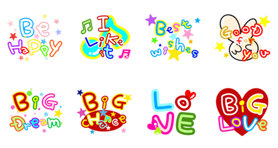 | スタンプ説明 | 届けたいメッセージを一言で... 心がHappyになりますように...☆ love・like・good・best・wishes・dream・chance... |