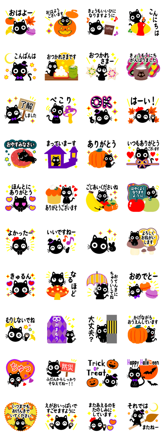 丸い目の真っ黒クロネコのスタンプです。秋に使える便利なセットです♪黒猫/クロネコ/くろねこ/可愛い/日常/挨拶/ねこがすき/秋/敬老の日/ハロウィン/十五夜/お月見/防災