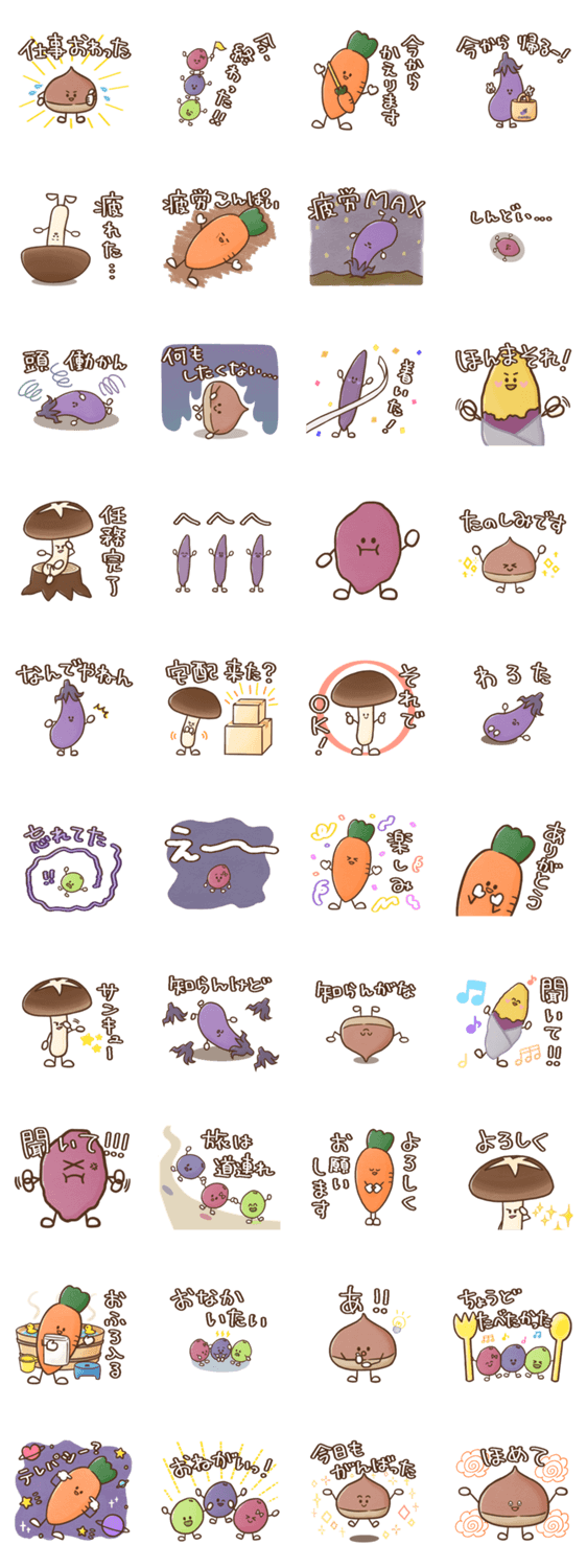『秋の味覚の仲間たち』のスタンプ第二弾です。日常的に使いやすいスタンプが多いと思います。 さつまいも / にんじん / ナス / しいたけ / ぶどう / くり
