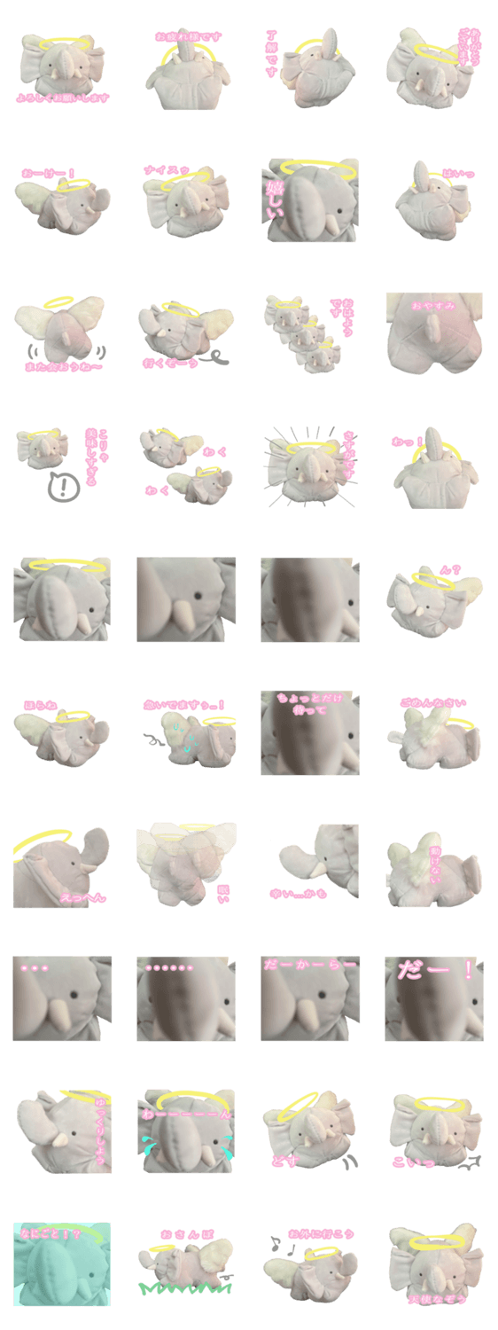 | スタンプ説明 | かわいいゾウのぬいぐるみスタンプです。天使のわっか。天使なかわいさ! |