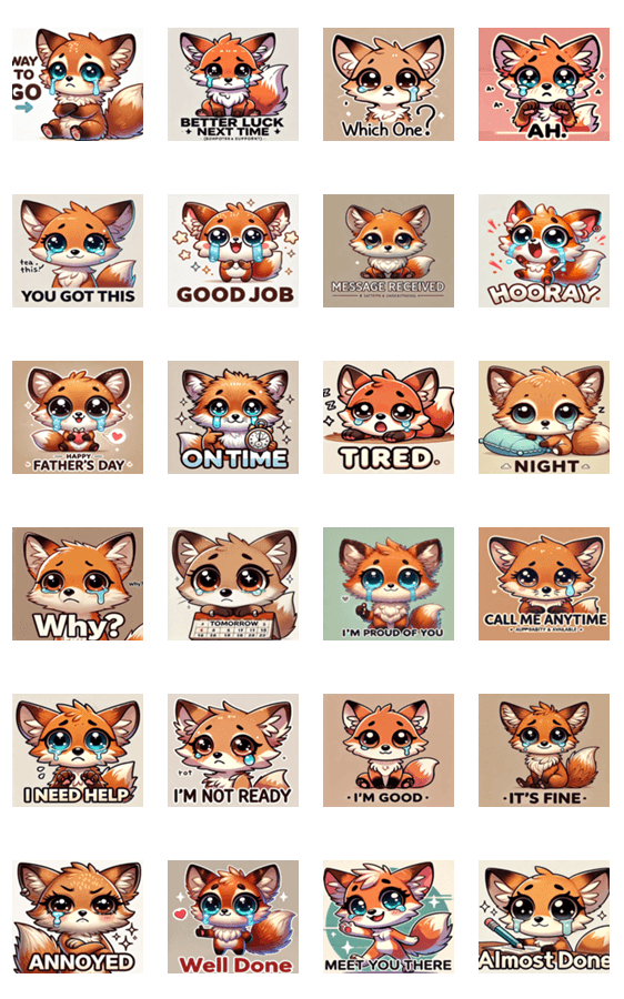 さまざまな感情を表現する、かわいいうるうるキツネのスタンプセット。チャットに可愛らしさをプラスします。