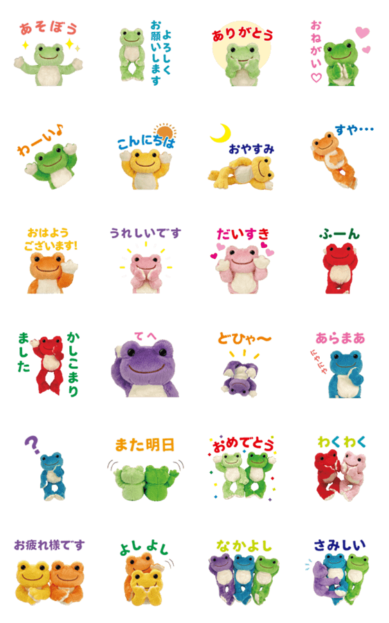 | スタンプ説明 | かえるのピクルスのぬいぐるみ写真がスタンプになりました!カラフルなピクルスでトークを盛り上げちゃいましょう♪ |